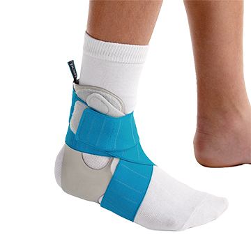 - サポーターに足をいれて、弾性ストラップをサポーターの側面に置きます。
